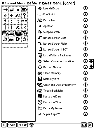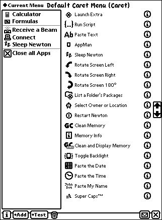 | The Stand Alone Menu Editor lets you create custom menus for your Newton or eMate. Commonly used actions can be included in menus, making them more convient and easy to use. You can make menus for each corner of the screen, the popup caret menu in the NotePad, and in the Extras Drawer. If you have a MP 2000 or MP 2100, you can also include a menu in the button bar. | |